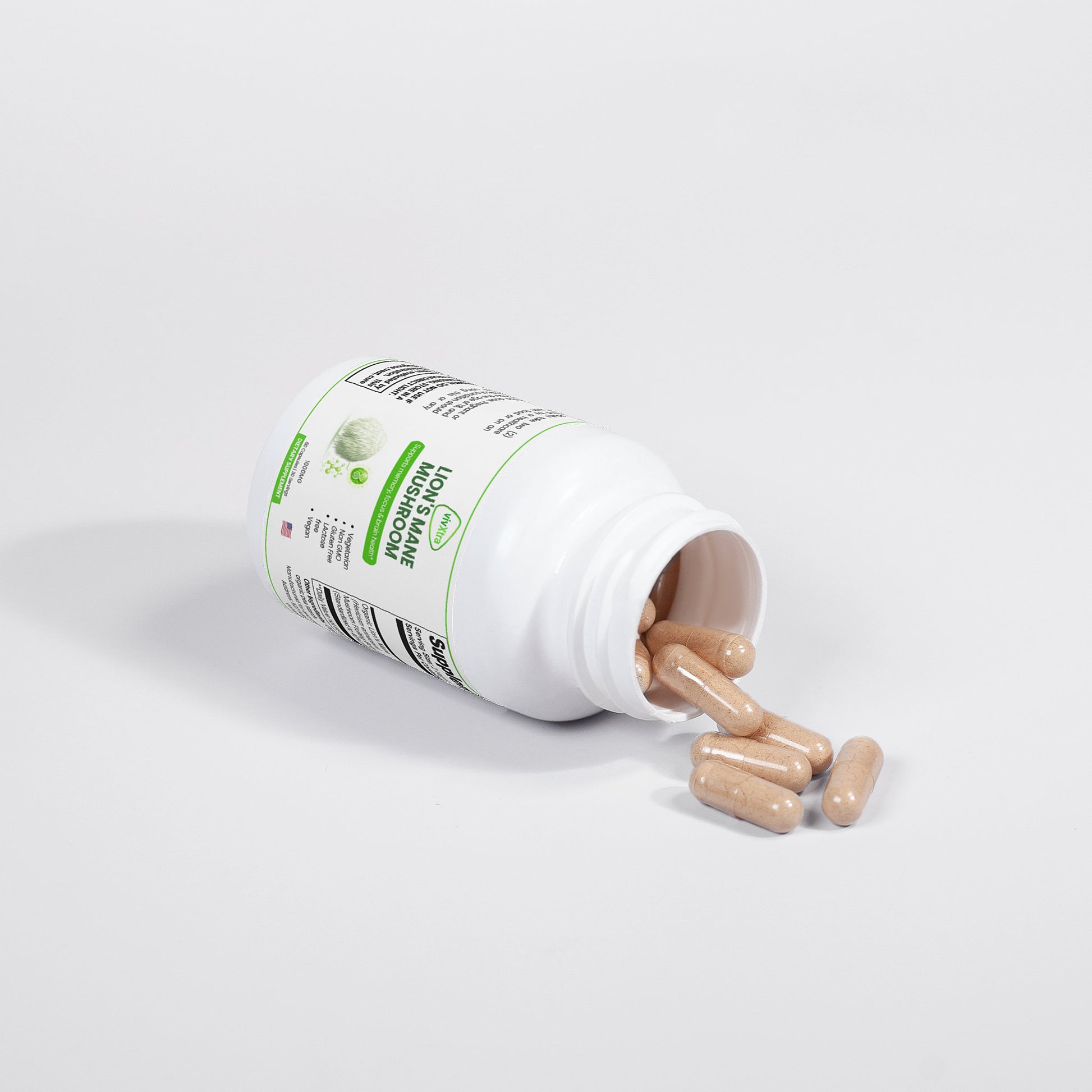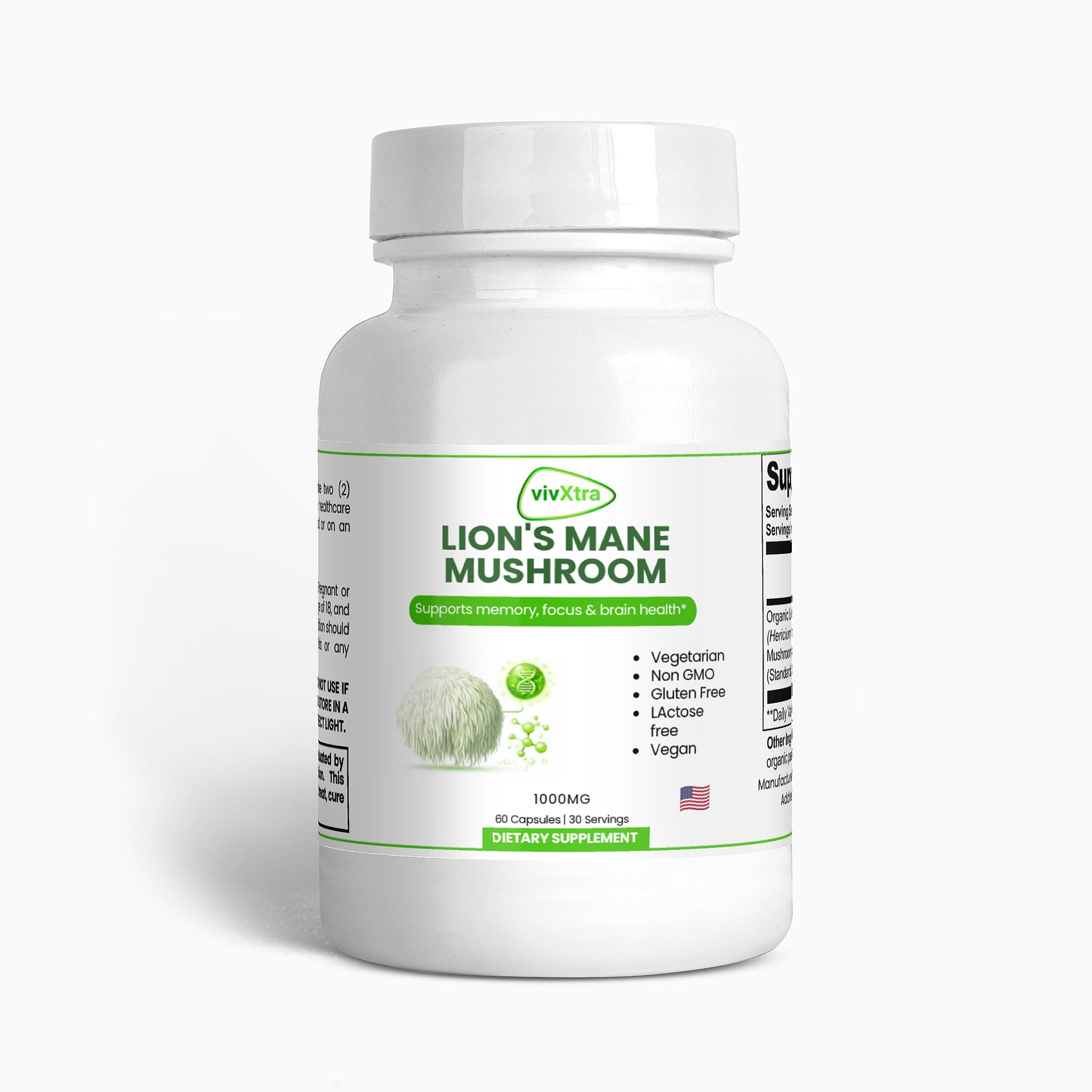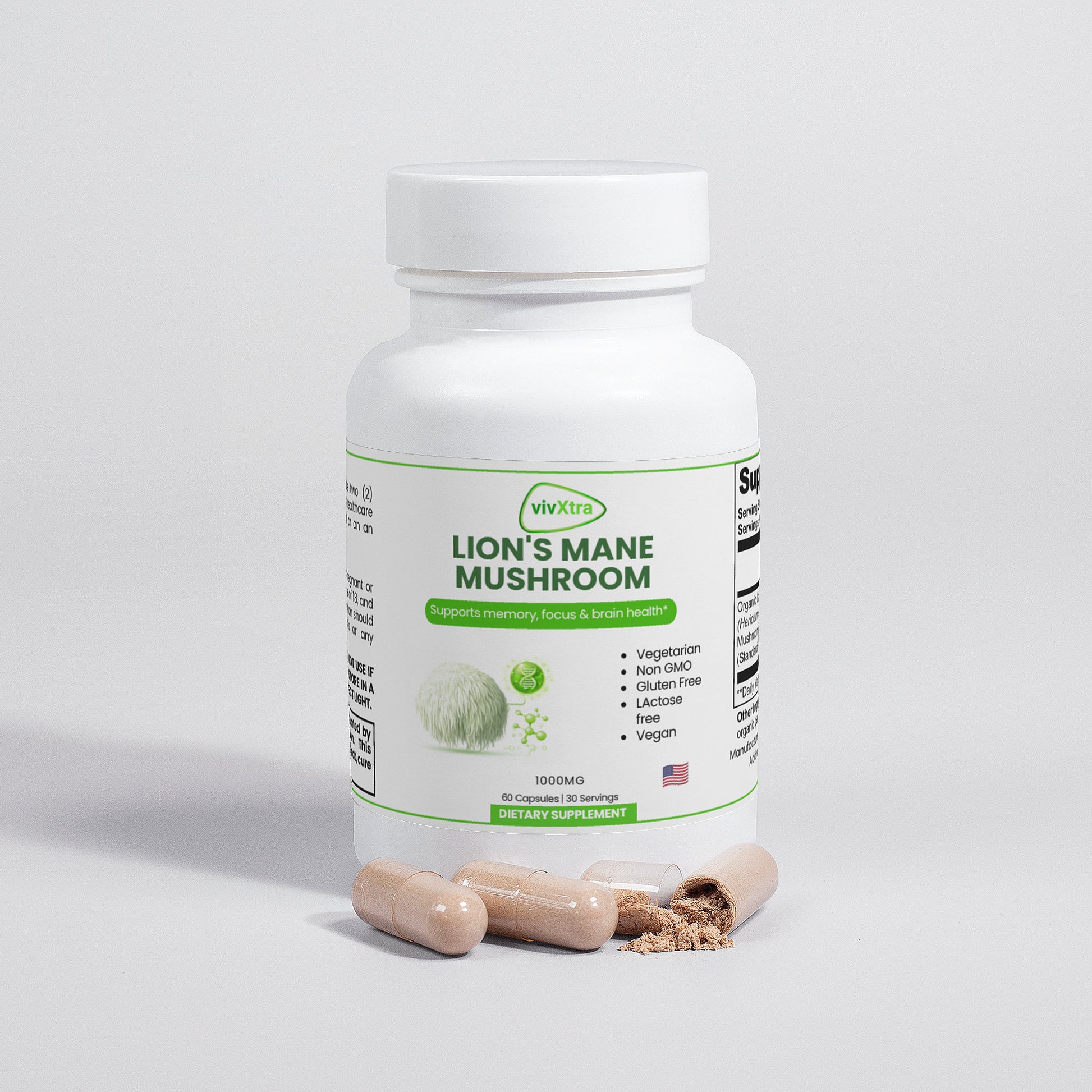 Organic Lion’s Mane (Hericum erinaceus) Mushroom Fruiting Body & Mycelium Powder (Standardized to 40% polysaccharides [400mg]), Organic capsule (pullulan, water), organic pea starch.